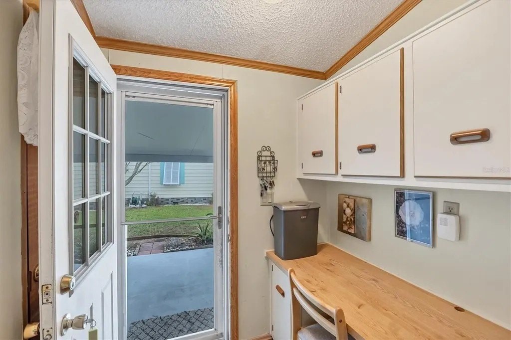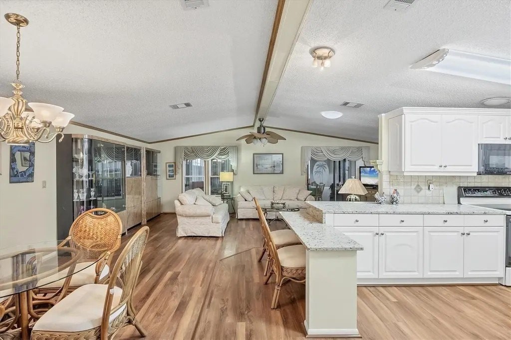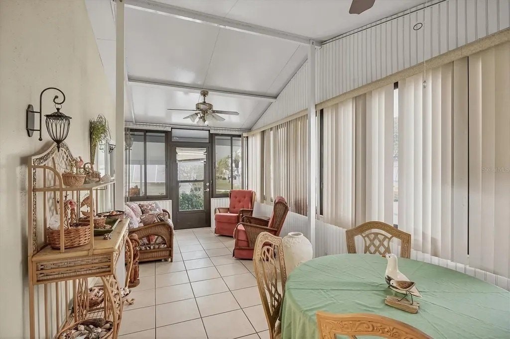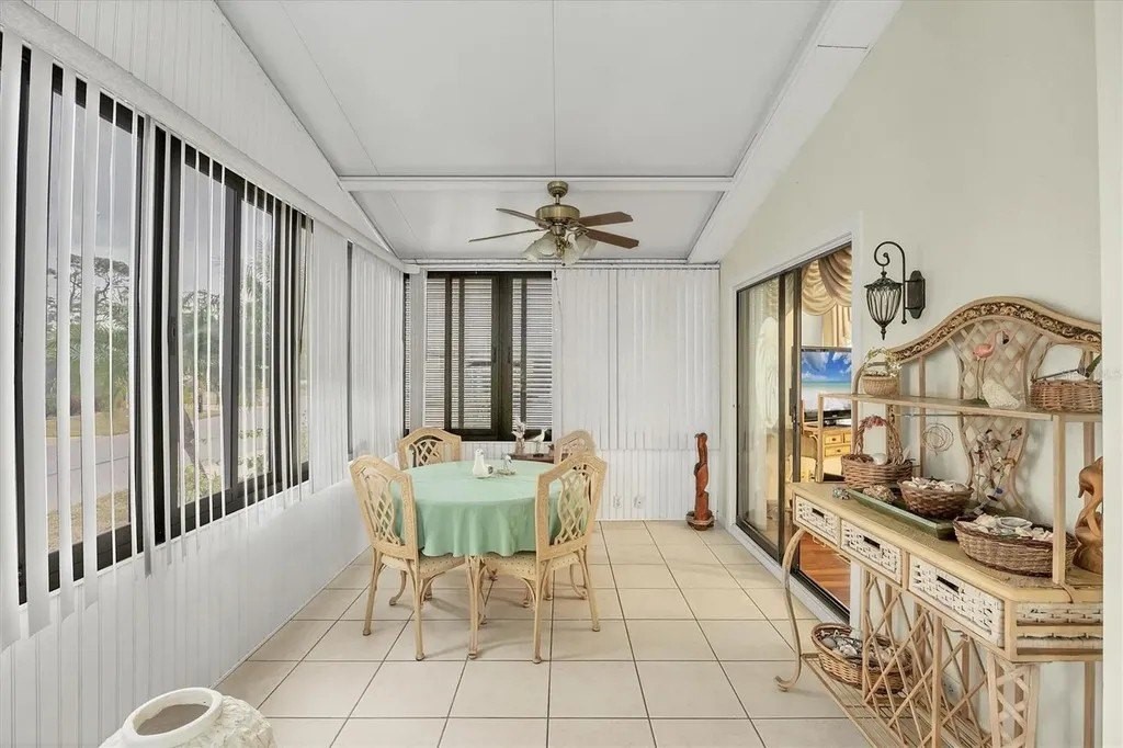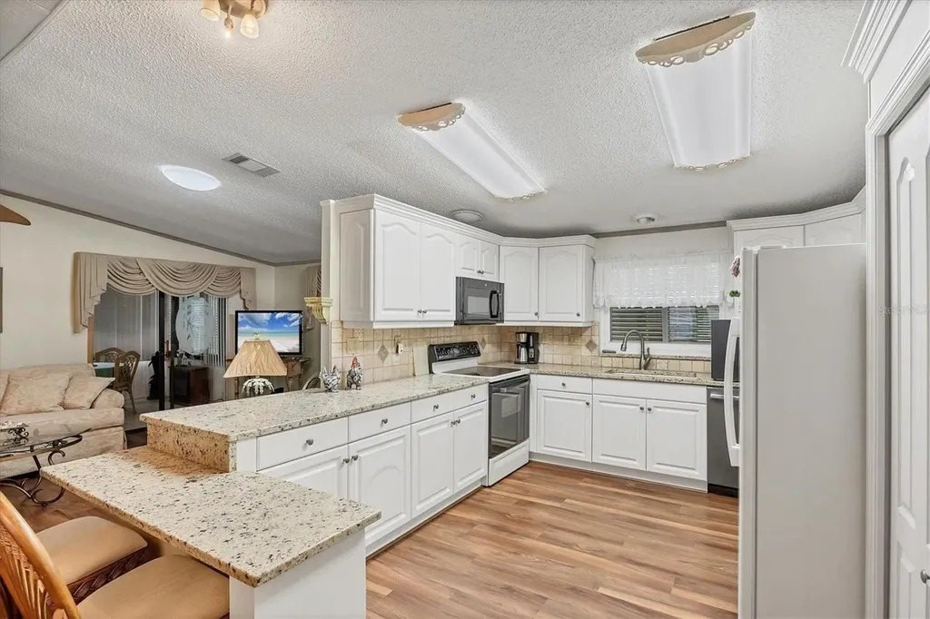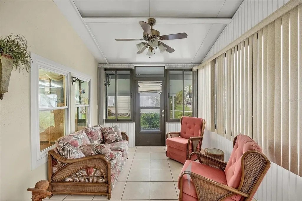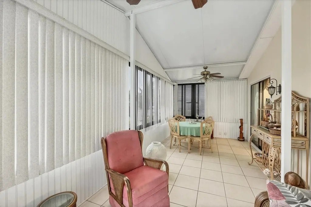 This beautifully decorated, turn-key furnished, 2-bedroom, 2-bathroom home is in Tangerine Woods. This highly sought after, over 55 community, is an active and friendly place to live! For your leisurely pleasure, this community provides you with a large heated pool and clubhouse, an exercise room and library, tennis and pickleball courts, walking trails, shuffleboard and so much more! This 2-car carport home, had a new A/C in 2025 and boasts well maintained laminate floors. A wonderfully large renovated kitchen, complete with new countertops and cupboards, which includes a breakfast bar and large pantry, is surely a chef's delight! The spacious great room is tastefully decorated and has sliders that lead to the tiled lanai, with new windows installed in 2009, is also neatly decorated, and extends your entertaining area. The master bedroom is beautifully furnished and has a nicely updated en suite bathroom, complete with dual sinks, a vanity and a step-in shower. The guest bedroom has a large closet and is also tastefully furnished. The guest bathroom has also been updated. Additionally, there is a bonus room that serves as a versatile flex space for either a home office, hobby room, library or storage, complete with counter space and cupboards. There is a large storge shed with plenty of shelves and counter space, that houses the washer and dryer. The yard is on a greenbelt that is lush and green and provides a tranquil setting. The low monthly HOA payment of $226 includes cable TV, internet and grass cutting, and Tangerine Woods is pet friendly! This community is close to Historic Dearborn St., which provides casual dining, evening entertainment, locally owned shops and a Farmers Market on Thursdays. The local beaches are just 4 miles away, as well as many local golf courses, and world class fishing! This house could be your next home-sweet-home!